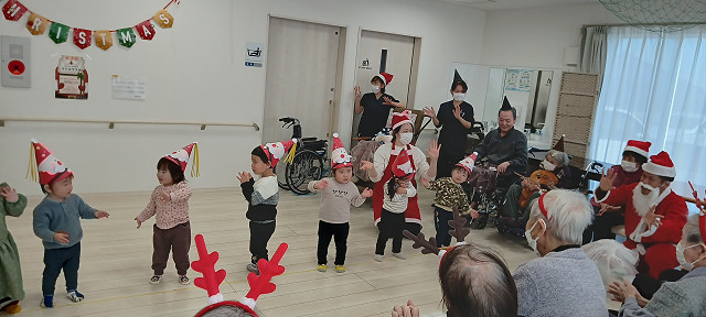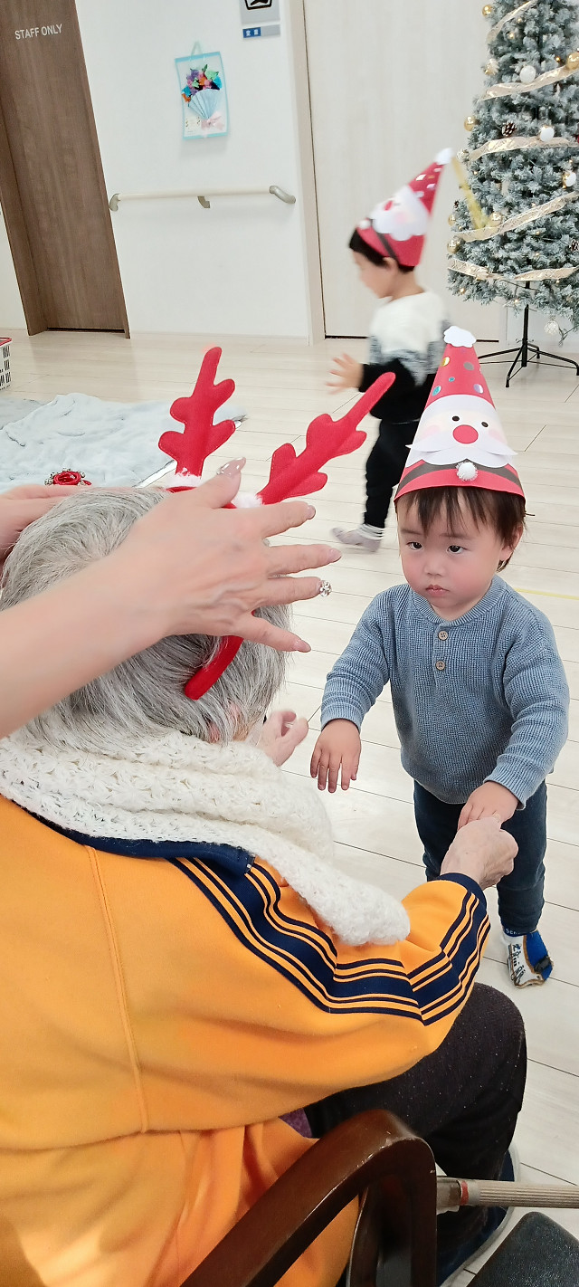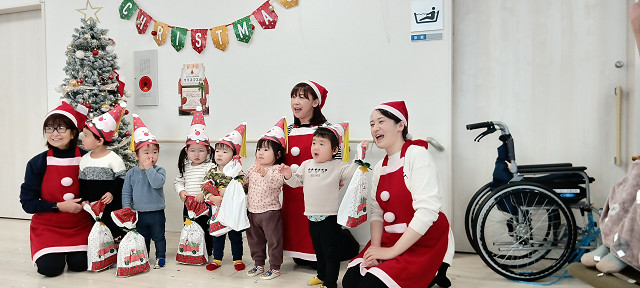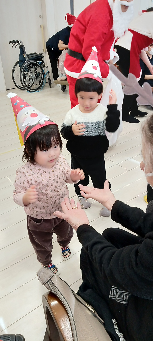最後には、園児たち、利用者さまにサンタクロースからメッセージ入りのクリスマスプレゼントいただき、利用者さまは感激した様子でプレゼントを眺めていました。世代を超えた温かい交流が生まれ、心がほっこりする素敵な時間となりました。