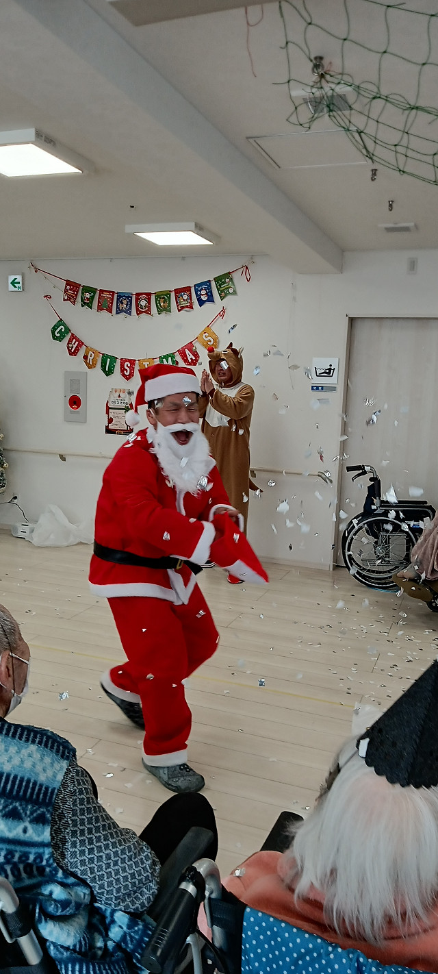 また、職員によるクリスマス寸劇も行われ、会場は大盛り上がり。クリスマス会の終盤、サンタクロースが雪を降らせる演出を行った際、利用者さまの驚きと、嬉しそうな表情がとても印象的でした。
